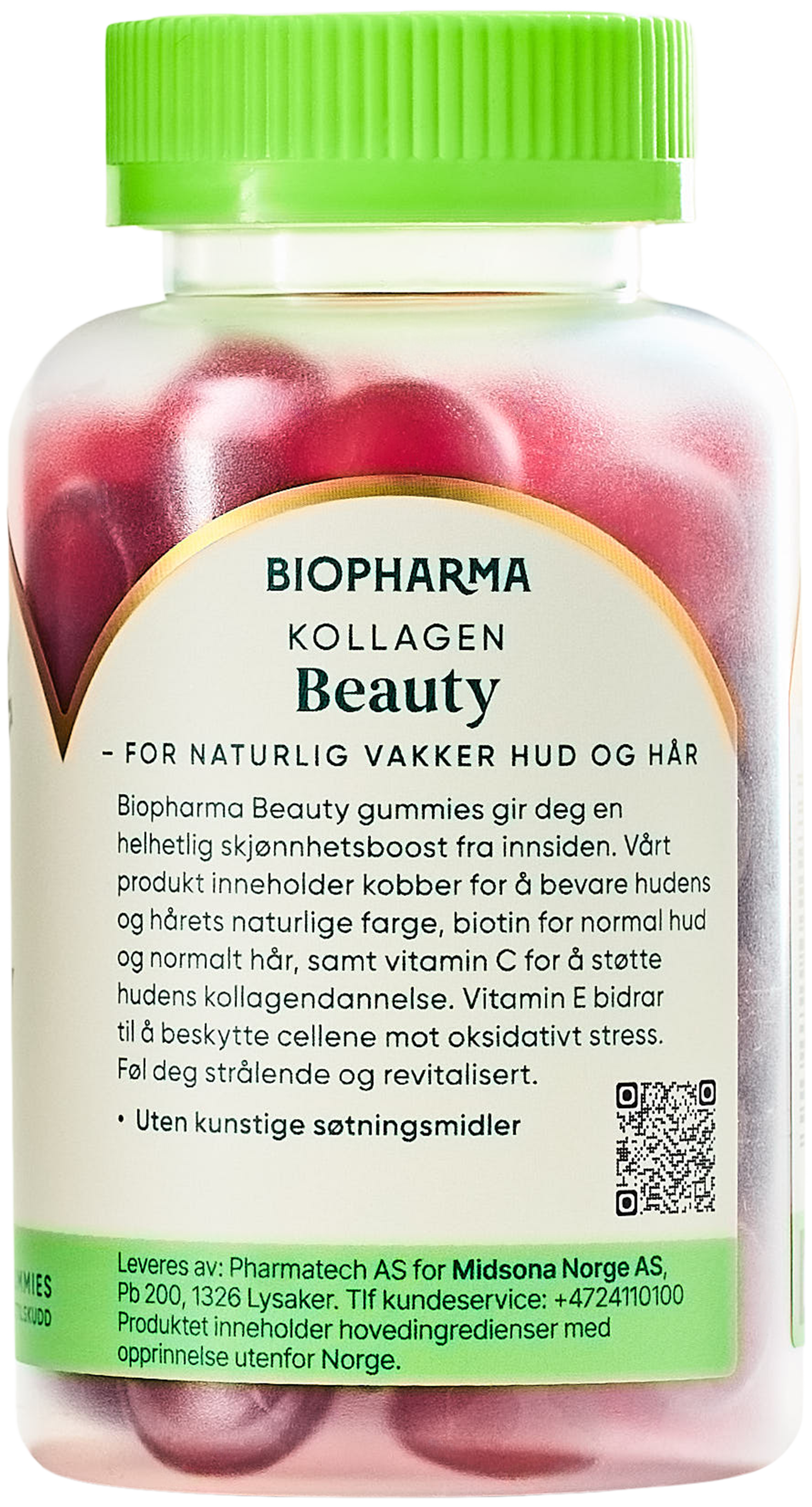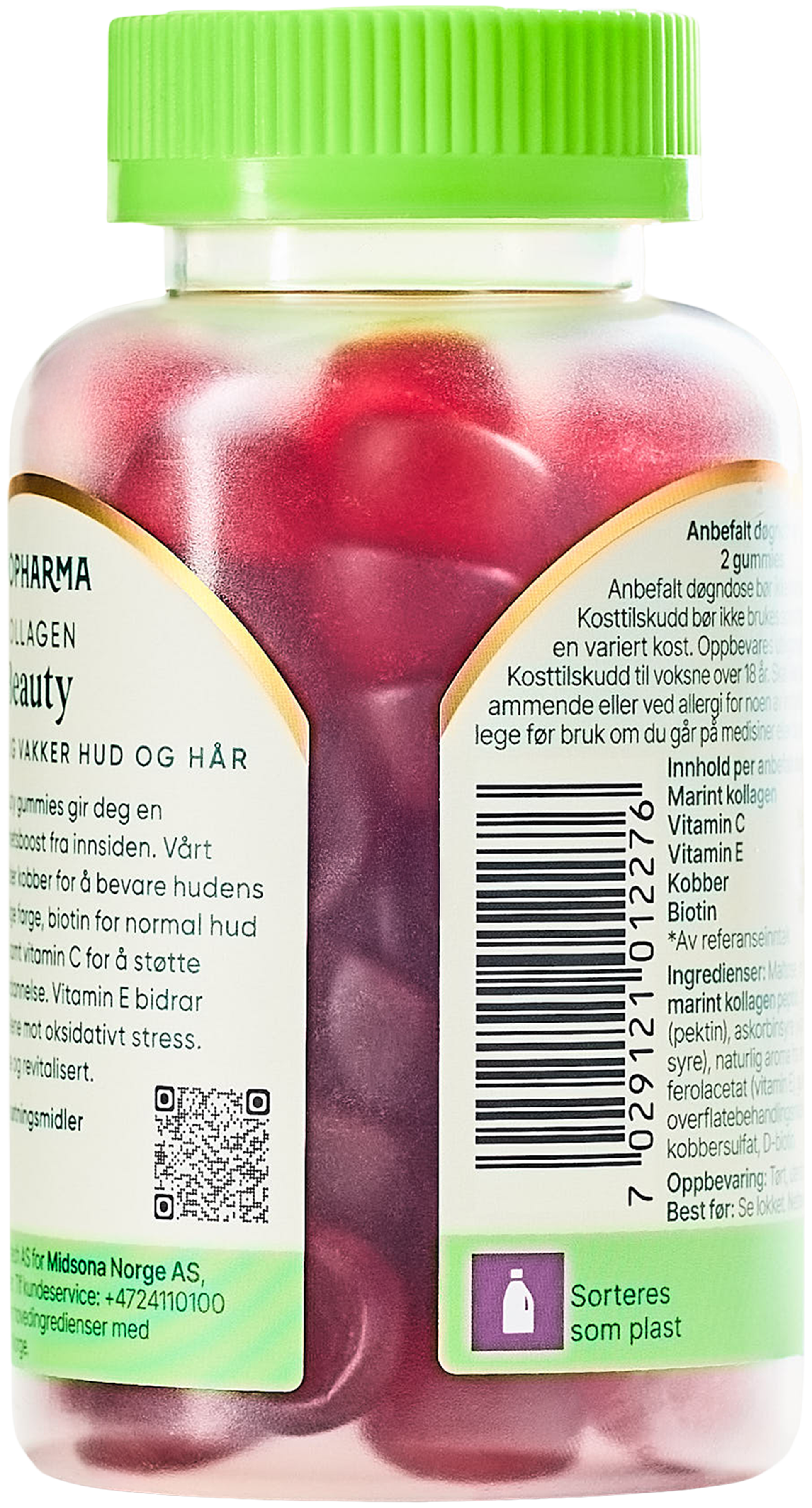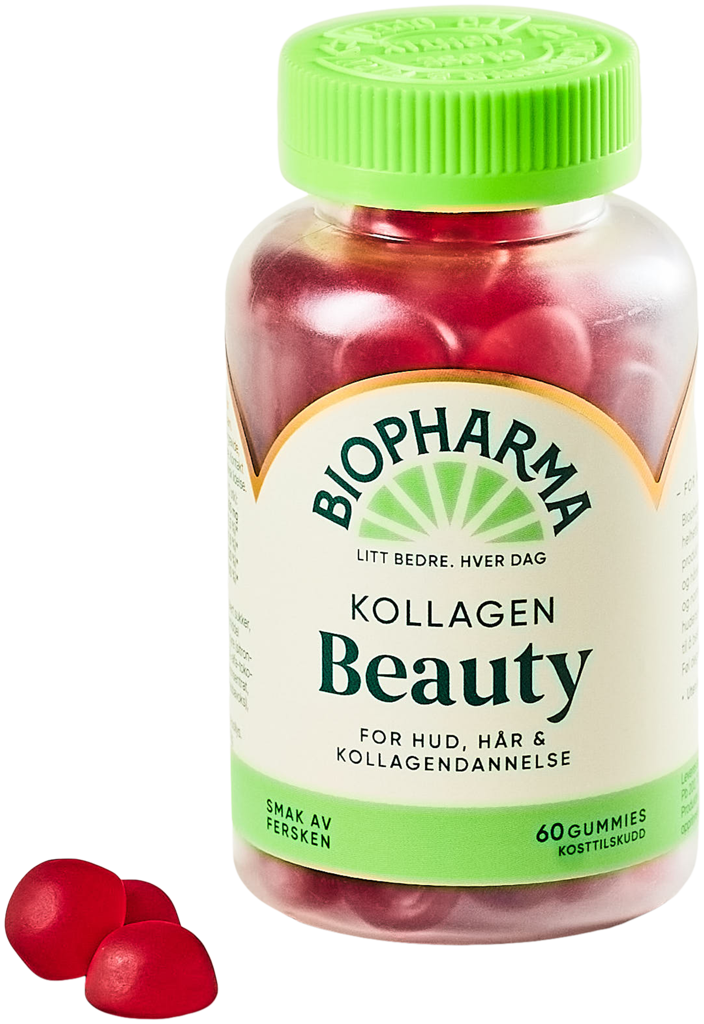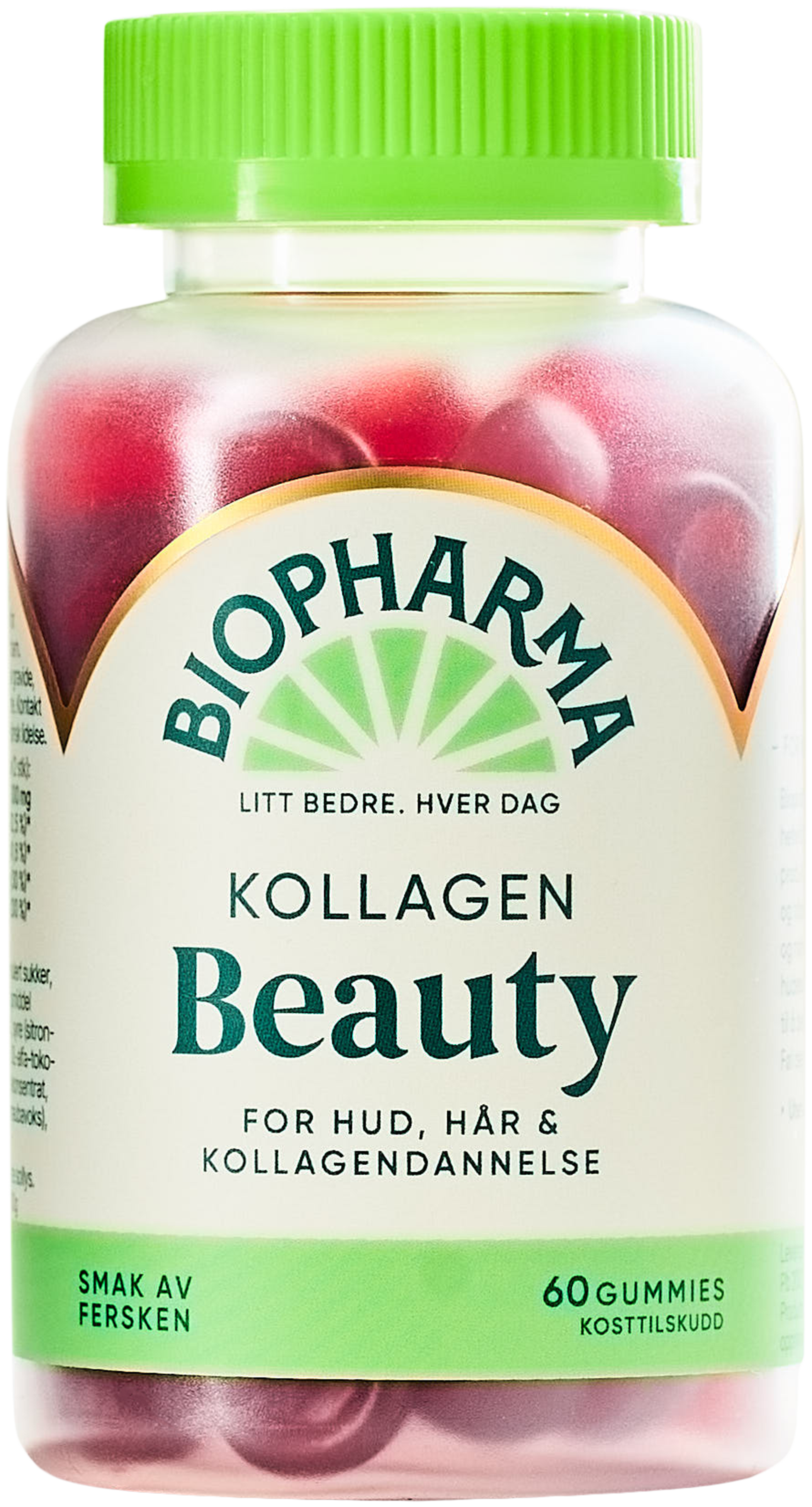 Maltose, hvitt granulert sukker, MARINT KOLLAGEN PEPTID(fisk), geleringsmiddel (pektin), askorbinsyre (vitamin C), syre (sitronsyre), naturlig aroma fra fersken, DL-alfa-tokoferolacetat (vitamin E), gulrotjuicekonsentrat, overflatebehandlingsmiddel (karnaubavoks), kobbesulfat, D-biotin.