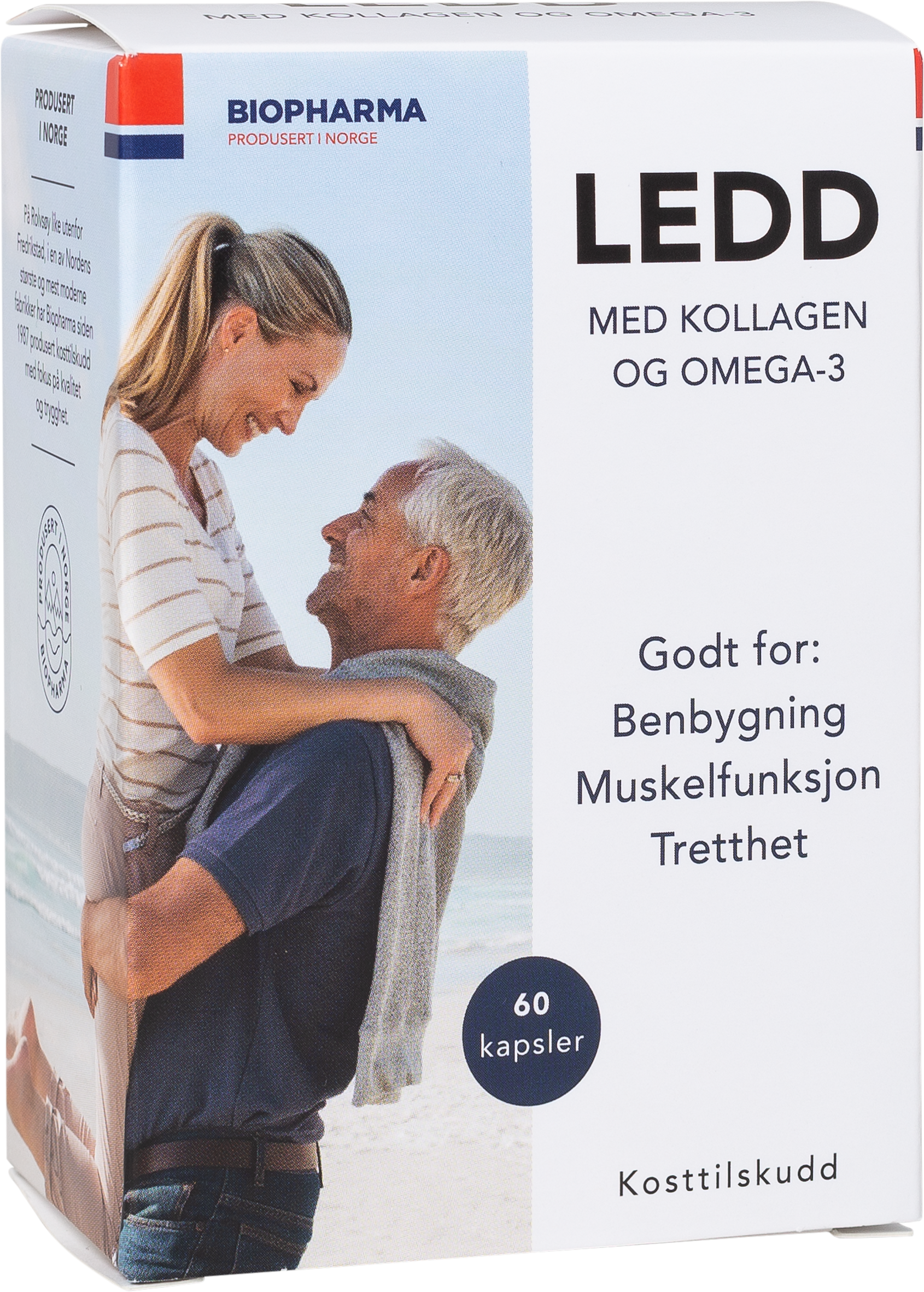 Biopharma Ledd hjelper deg med å opprettholde normal muskelfunksjon og benbygning. Leddene i kroppen vår dannes av knokler. Brusken er det som danner de to beinendene på knoklene i leddet. Om brusken slites og blir tynnere vil rommet mellom bli smalere og stive ledd kan oppstå. Biopharma Ledd inneholder vitamin C og vitamin D i tillegg til hydrolysert kollagen type II og camelinaolje (planteolje) som er rik på omega-3-fettsyren ALA. Vitamin C bidrar til normal kollagendannelse, som har betydning for bruskens og knoklenes normale funksjon. Vitamin C bidrar også til å redusere tretthet og utmattelse. Vitamin D bidrar til å opprettholde normal muskelfunksjon og normale knokler.
