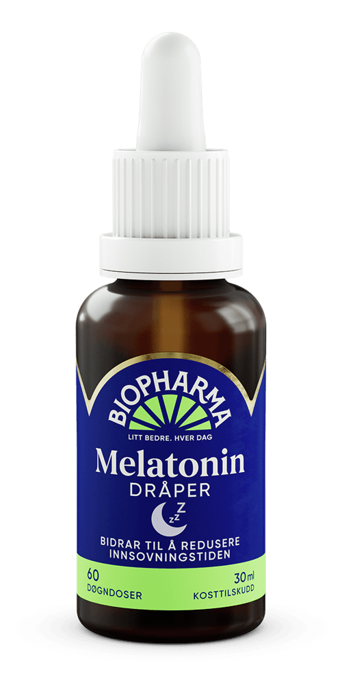 Biopharma Melatonin Dråper er et hjelpemiddel som kan bidra til bedre søvnkvalitet, redusere innsovningstiden og redusere opplevelsen av jetlag. Produktet har en mild søt smak som gjør det enkelt å innta, og er lett å dosere enten ved å telle antall dråper eller ved å bruke merkingen på pipetten. Melatonin bidrar til å redusere innsovningstiden. Den gunstige virkningen oppnås ved å innta 1 mg melatonin ved leggetid. Melatonin bidrar også til å lindre den subjektive opplevelsen av jetlag. Den gunstige virkningen oppnås ved å innta minst 0,5 mg melatonin ved leggetid den første reisedagen og deretter noen dager etter ankomst til reisemålet.