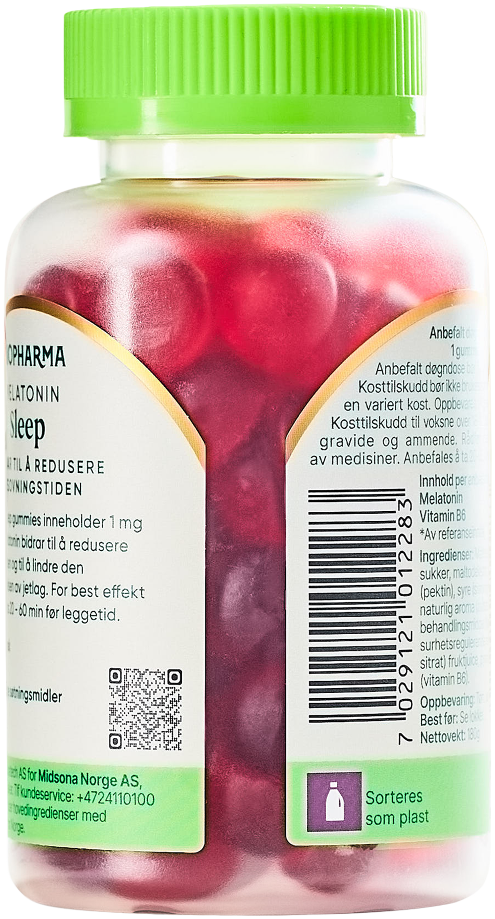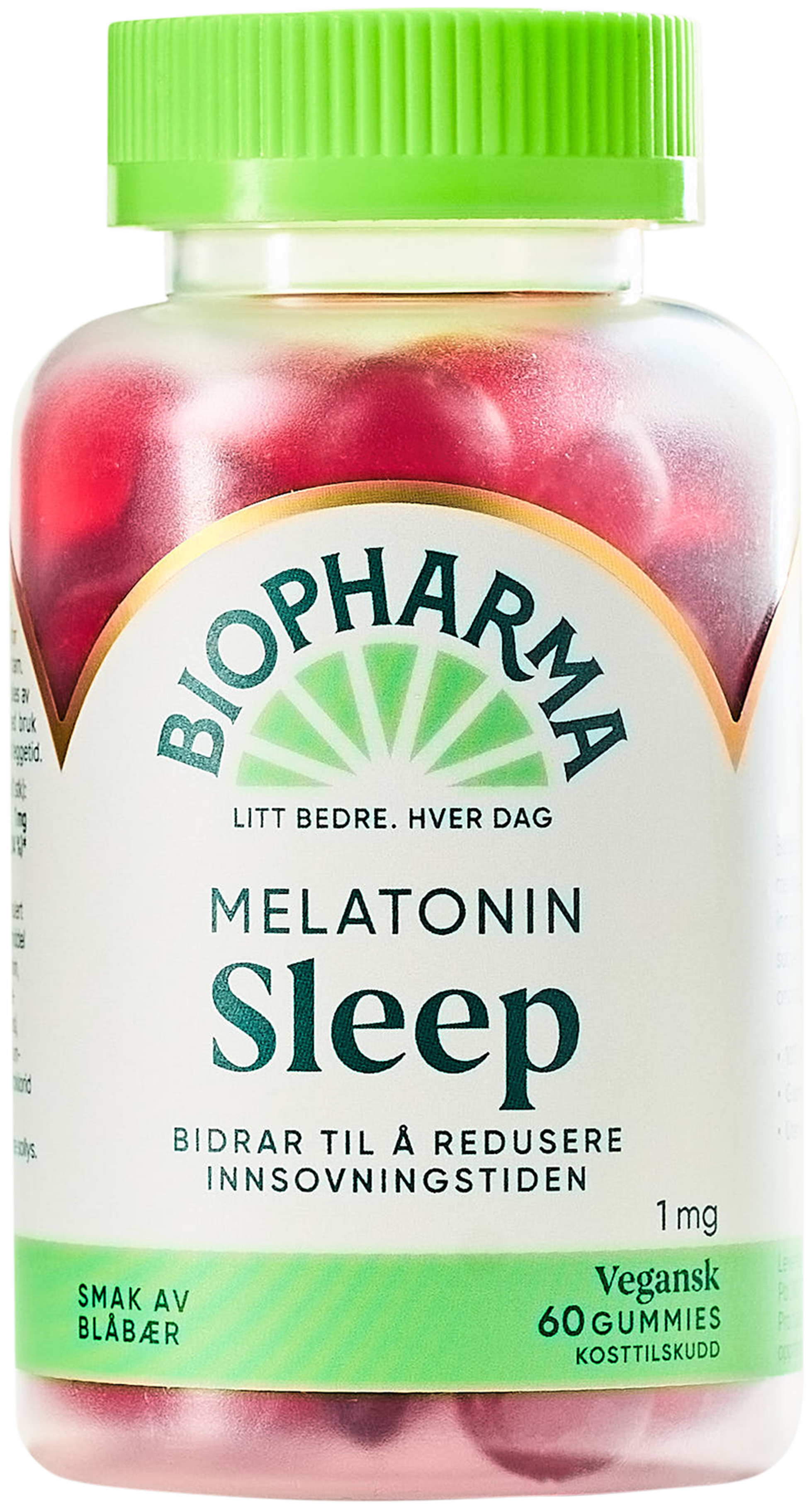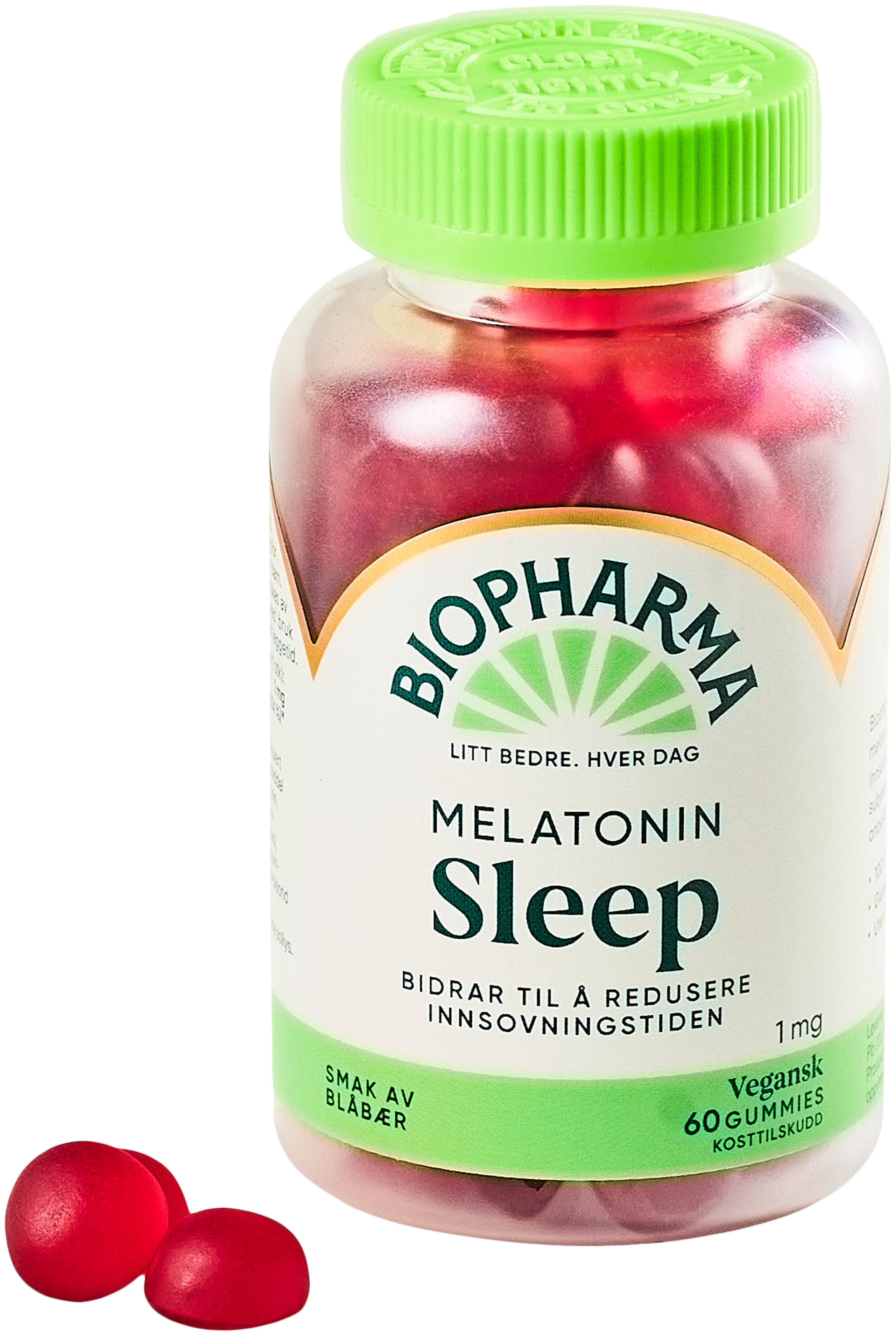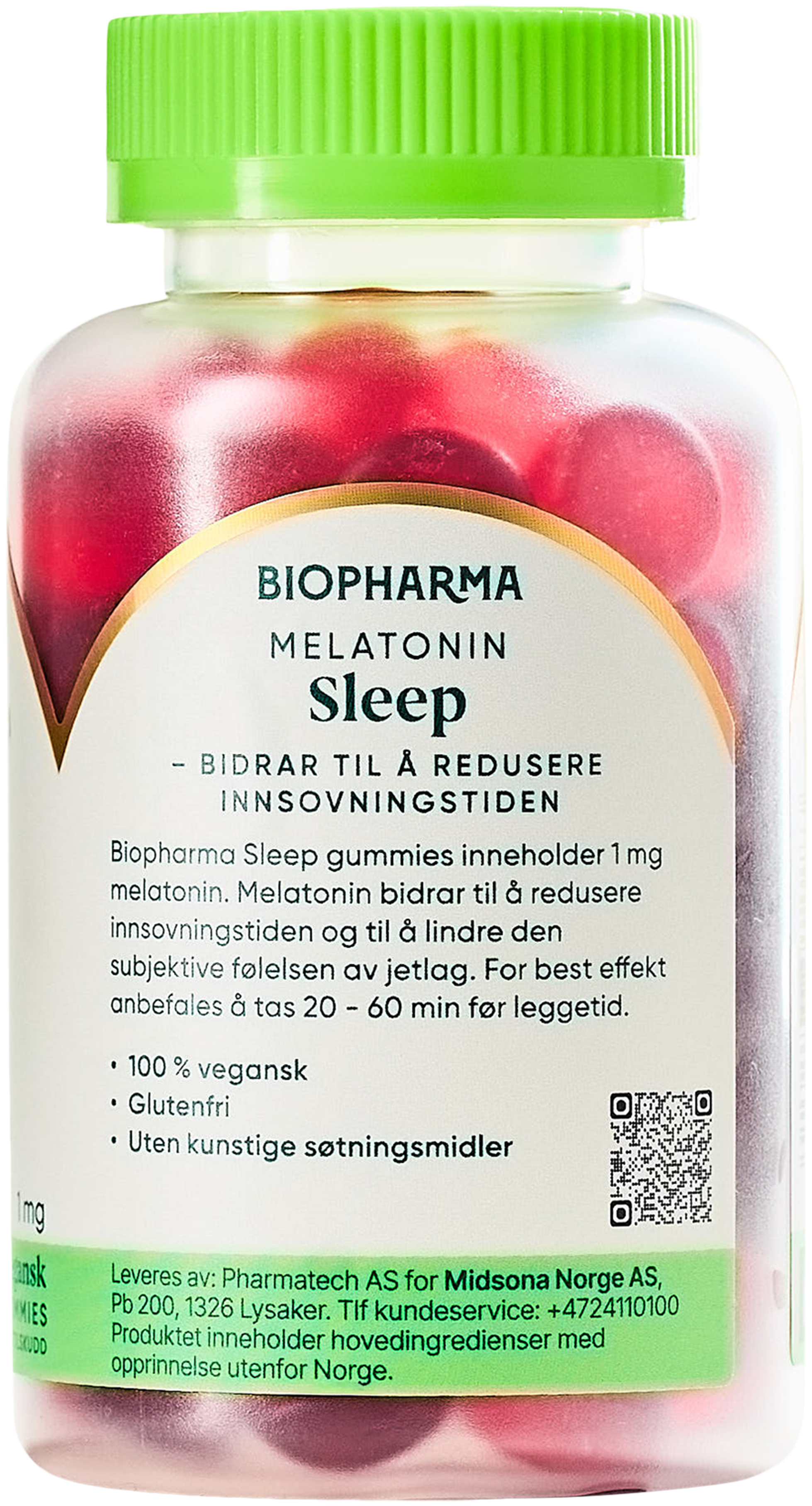Biopharma Melatonin Sleep Gummies inneholder Melatonin som bidrar til å redusere innsovningstiden og til å lindre subjektive følelse av jetlag.
