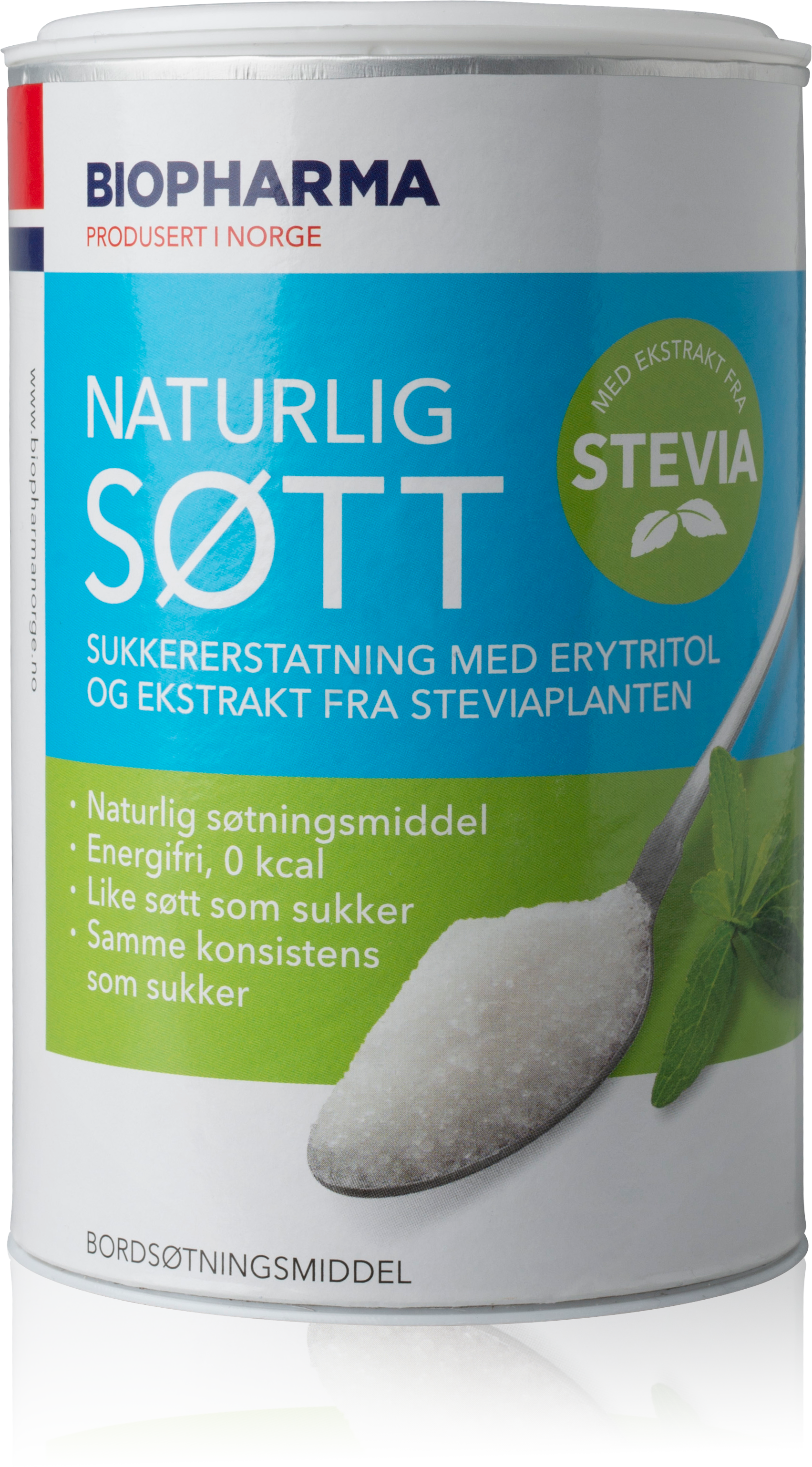 Biopharma Naturlig Søtt er et bordsøtningsmiddel basert på erytritol, en naturlig sukkeralkohol fra frukt, og ekstrakt fra steviaplanten (steviolglykosid).