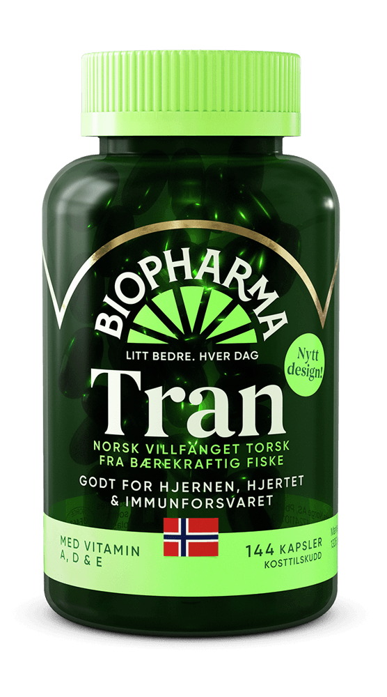 Biopharma trankapsler gir deg alt fra den gode tranen, i en enkel liten kapsel. Biopharma trankapsler er laget av Norsk villfanget torsk, fra bærekraftig fiske. Produktet er tilsatt ekstra vitamin D, A og E, og gir deg omega-3-fettsyrene DHA og EPA. Godt for hjernen, immunforsvaret og hjertet.